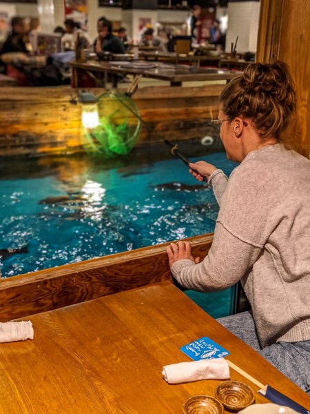 So, at Zauo, you fish for your dinner. There are lots of different fishes swimming around in the waters and you’re given a fishing rod to try and get one to catch. Once they’ve taken the bait, you lift it up, the bells are rung, and you can choose how you want it cooked in the kitchen.