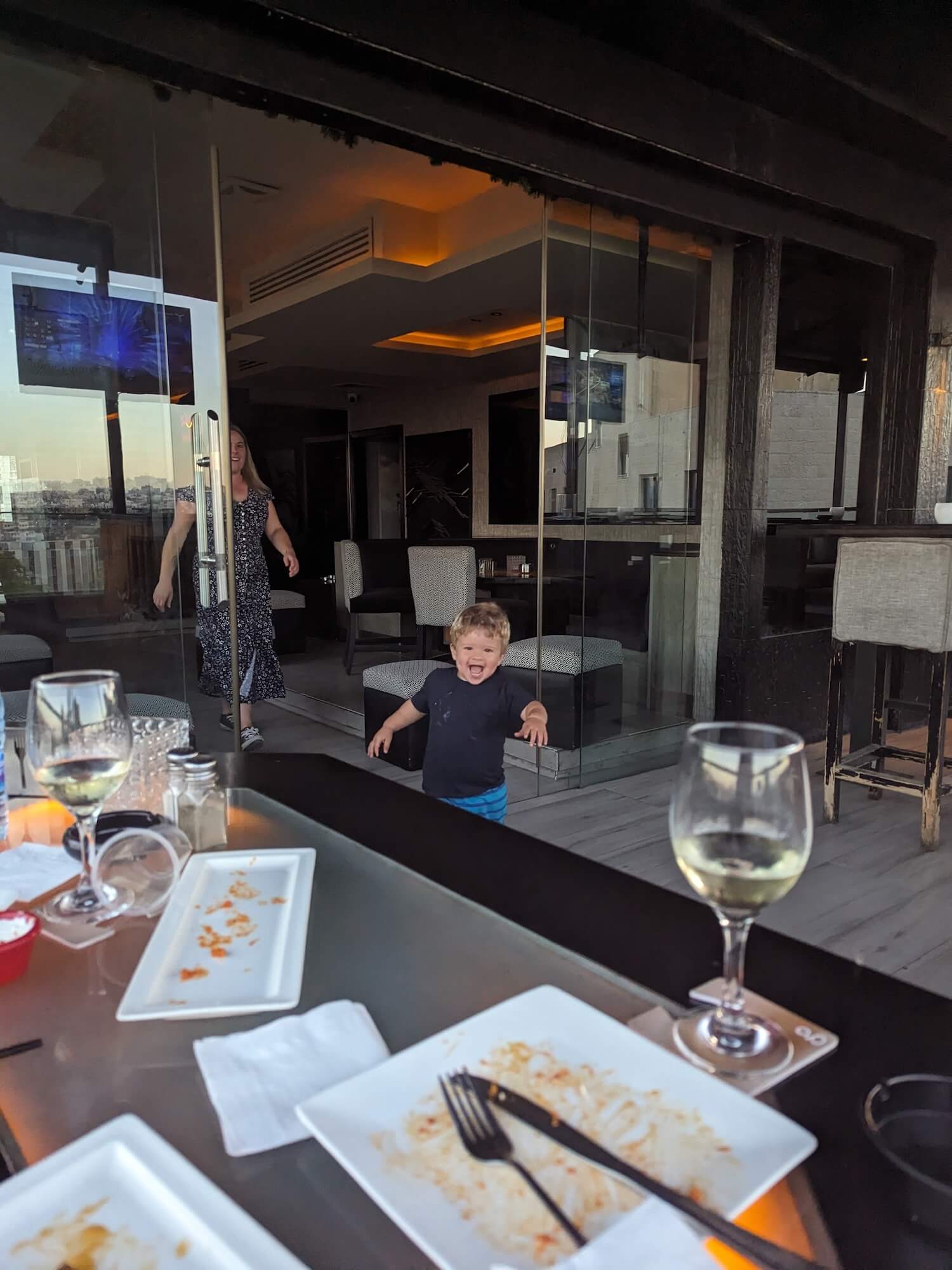 We decided to head back home and go to the Cafe Maestro rooftop bar opposite our hotel. Another swift 2JOD Uber ride later and we were home. We stashed the pushchair in the hotel reception and wandered over the road and up in the lift to the Cafe Maestro rooftop. The staff were lovely and welcoming to Reggie – I worried they wouldn’t want him at 8pm but, they did.