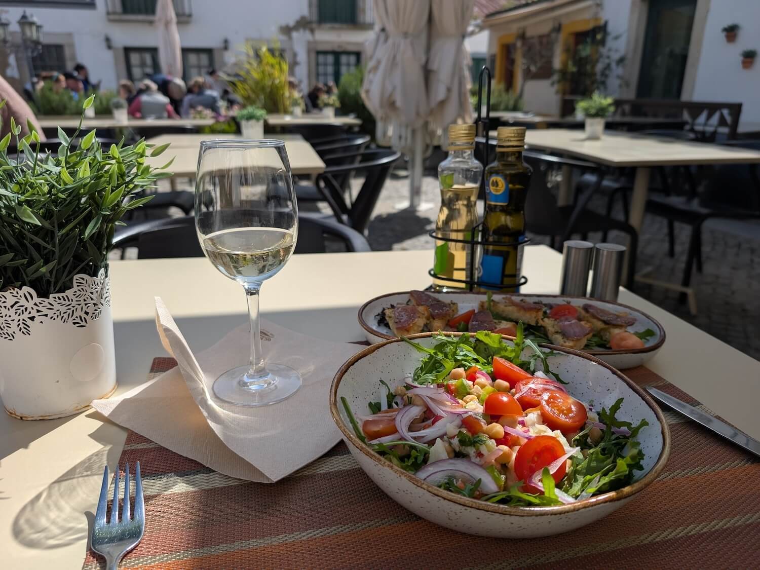 I went for the traditional Algarvian cod salad, and a ‘Tiborna’ of dried tuna ‘muxama’ with olive oil and oregano off the appetiser menu. The sun helped, but devouring this with a glass of wine outside was pretty special. The staff were lovely too.