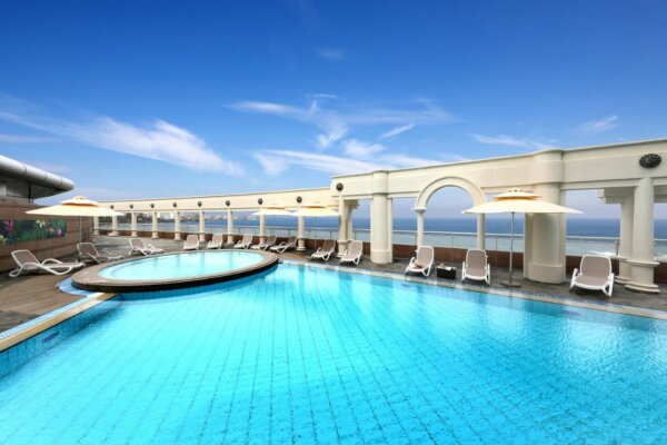 This accommodation on Jeju Island ensures guests have everything they need, including a pool bar with views over the city from above. You can also see the mountains and volcanoes on the island.
